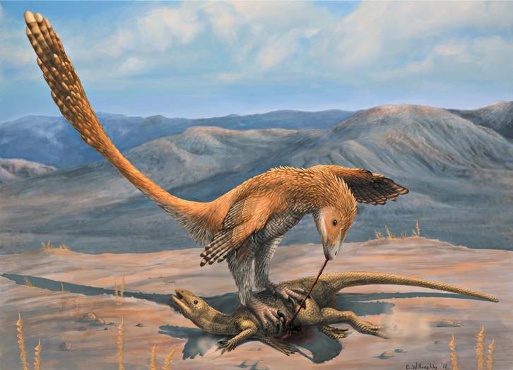 Как использовались эти серповидные когти? Раньше была популярной гипотеза, что они выполняли режущую функцию: разрезали живот или бок жертвы, чтобы выпотрошить ее. Сейчас такое использование когтей представляется крайне маловероятным. Тесты, выполненные при помощи копий когтей и механических моделей лап, показали, что они плохо разрезают плоть. К тому же в теле жертвы не так много мест, которые легко разрезаются. Если посмотреть на современных животных, то аналогичный увеличенный коготь на втором пальце есть у соколов и ястребов. Когтями они не режут и не потрошат жертву, а пришпиливают ее к земле. Убивают же они клювом, а не когтями. Наверное, это более реалистичный взгляд на хищническое поведение динозавров: вероятно, они запрыгивали на спину добычи, придавливали ее к земле своим весом, а затем кусали. Возможно, не случайно, что у этих теропод были длинные передние лапы, полностью покрытые перьями: видимо, им нужно было удерживать равновесие на сопротивляющейся жертве, и крылообразные передние конечности в этом помогали.