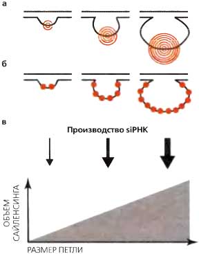 В модели а предполагается, что одиночные транскрипционные комплексы в более крупных петлях обладают большей транскрипционной активностью, чем в более мелких, что обозначается числом красных концентрических кругов. Модель б предполагает, что более крупные петли могут содержать большее количество транскрипционных комплексов (красные шарики), чем более мелкие петли, (в) В обеих моделях не спаренная ДНК в больших петлях продуцировала бы более высокие концентрации siRNAs (показано величиной стрелок) и, таким образом, больший объем сайленсинга (адаптировано, с любезного разрешения, из Lee et al., 2004 [©Genetics Society of America])