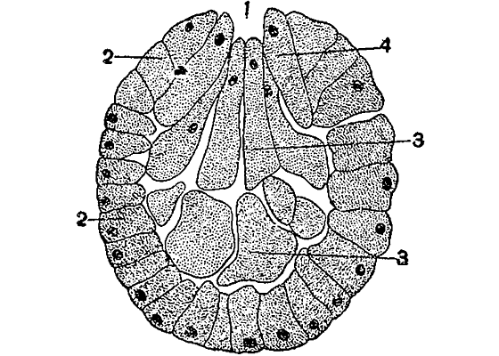 1 — бластопор (первичный рот); 2 — эктодерма; 3 — энтодерма; 4 — клетки, дающие мезодерму.