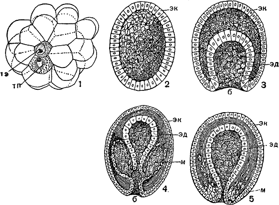 1 — зародыш сагитты (Sagitta) на стадии 32 бластомеров; ясно виден зачаток энтодермы (тэ, телобласт энтодермы) и половой зачаток (тп); 2 — бластула; 3 — гаструла; 4 — образование мезодермы путем парного выпячивания стенок первичного кишечника (энтероцельный способ); 5 — образование мезодермы путем врастания клеток, образующих позже мезодермальные полоски (эктероцельный способ); м — мезодерма, эд — энтодерма, эк — эктодерма.