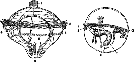 1 — теменной пучок неподвижных ресничек; 2 — предротовой венчик ресничек; 3 — послеротовой венчик; 4 — рот; 5 — кишка; 6 — анальное отверстие.