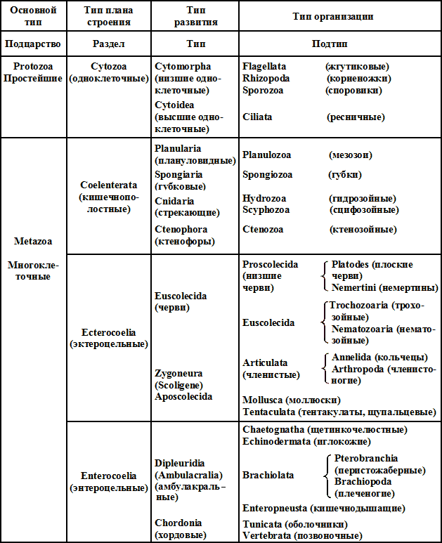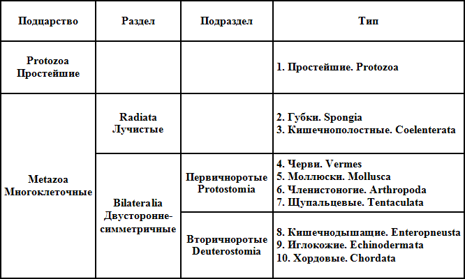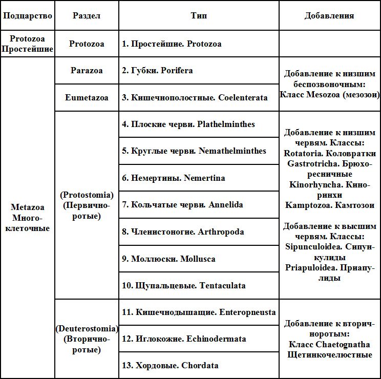 1. Простейшие (4 класса). — 2. Кишечнополостные (с включением подтипа губок). — 3. Черви (3 подтипа, с включением как добавления всех червеобразных, кишечнодышащих, оболочников). — 4. Моллюски. — 5. Иглокожие. — 6. Членистоногие. — 7. Позвоночные.