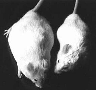 Рис. 32. Фотография нормальной мыши (справа) и трансгенной, содержащей ген гормона роста человека (слева)