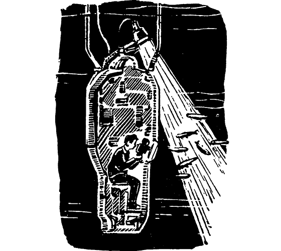 Из-за недостатка места внутри подводного шара удалось установить лишь самые необходимые приборы. К корпусу батисферы была приделана большая скоба. Привязав к скобе прочный стальной трос, батисферу опускали под воду с борта корабля. Предприятие было рискованное: стоило тросу оборваться — и пассажиры оказались бы погребенными на дне океана.