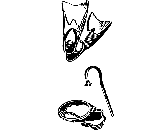 Но акваланг доступен не всем. Одним он дорог, другим противопоказан по состоянию здоровья. Можно обойтись и без него. Для этого достаточно приобрести маску, дыхательную трубку и ласты. Маска изготавливается из резины и, плотно прилегая к лицу, закрывает глаза и нос. Наблюдение ведется через стекло, вставленное в маску как раз против глаз. Дыхательную, обычно пластмассовую, трубку держат во рту — она позволяет плыть под поверхностью воды. Трубка короткая, и поэтому, если требуется нырнуть поглубже, нужно задержать дыхание так, как это делает обыкновенный ныряльщик. Ласты резиновые. Они прикрепляются к ступням и позволяют плыть даже без помощи рук.