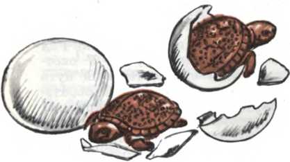Морские черепахи каждую весну оставляют свои охотничьи угодья и отправляются к песчаным отмелям. Здесь в сухом песке за линией прилива они выкапывают глубокие ямы и откладывают в них яйца. Зарыв гнездо и плотно утрамбовав сверху песок, матери уплывают в море. На этом забота черепах о потомстве и кончается. Через месяц, а иногда и больше из яиц выклевываются черепашки. Им предстоит трудная задача — пробить твердую скорлупу, выбраться из-под толстого и плотного слоя песка и совершить опасный переход от гнезда к морю. Ясно, что многое они должны постигнуть еще в яйце. Поэтому унаследованные рефлексы созревают у них значительно раньше, чем черепашка острым шипом, расположенным на морде, пробьет яичную скорлупу.