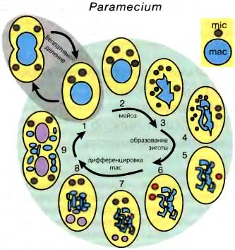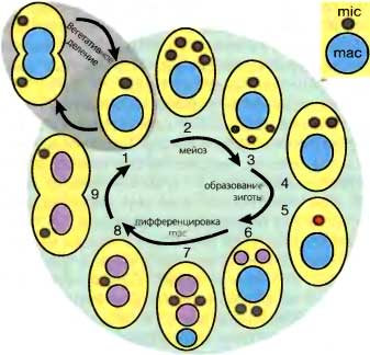 (Стадия 1) Вегетативные клетки размножаются бинарным делением. Половое развитие (стадии 2—8) обычно начинается после конъюгации двух клеток или автогамии (только у Paramecium).