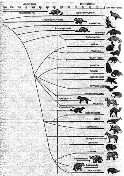 «Древо» млекопитающих по М. Новачеку. До них еще не близко, но путь жизни явной лежит туда… Самые первые звери — вымершие еще в эру динозавров триконодонты, очень еще похожие на звероящеров цинодонтов… Следующие — однопроходные утконос и ехидна, которых некоторые биологи считают дожившими до наших дней звероящерами. Обратите внимание на ближайших соседей по древу, то есть родичей приматов. Это тупайи, которые здесь выделены в отдельный отряд, но у других биологов все еще числятся насекомоядными. Это летучие мыши. И шерстокрылы.
