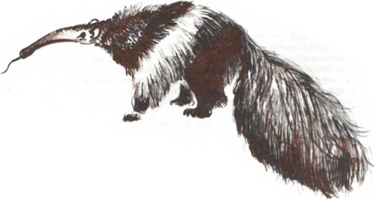 Очень странный зверь — большой муравьед. Он живет в тропических лесах Южной Америки. Вид муравьеда настолько необычен, что когда его, по словам работников одного из зоопарков, поместили в обезьянник, «то обезьяны так шумели и бесновались, что пришлось завесить их клетки, и даже шимпанзе при виде ужасного животного со страха зарылся в солому».