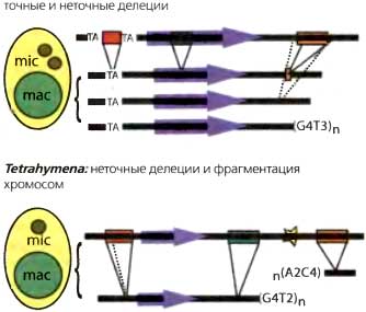 В ходе развития нового макронуклеуса происходят широкомасштабные фрагментация хромосом и элиминация ДНК. (Вверху) Перестройки ДНК, происходящие у Paramecium, включают как точные делеции IESs, ограниченных нуклеотидами ТА (цветные прямоугольники, находящиеся в кодирующих (стрелка) и некодирующих районах), так и неточные делециии (оранжевые прямоугольники), дающие в результате либо делецию ДНК. либо фрагментацию (G4T3). (Внизу) У Tetrahymena неточная деления IESs (цветные прямоугольники) происходит примерно в 6000 локусов, а фрагментация хромосом детерминируется консервативной последовательностью длиной 15 пн — CBS (звездочка)