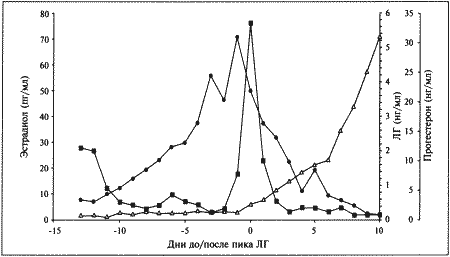 Изменения концентрации эстрадиола (?), лютеинизирующего гормона (ЛГ,) и прогестерона (?) в сыворотке крови у сук. На графике за точку отсчета принят день пика концентрации ЛГ. Следует отметить, что пик концентрации эстрадиола приходится на день минус 1, уже на день 0 заметно повышение концентрации прогестерона. (Перевод единиц: 1 пг/мл эстрадиола = 3,6 пмоль/л; 1 нг/мл прогестерона = 3 нмоль/л)