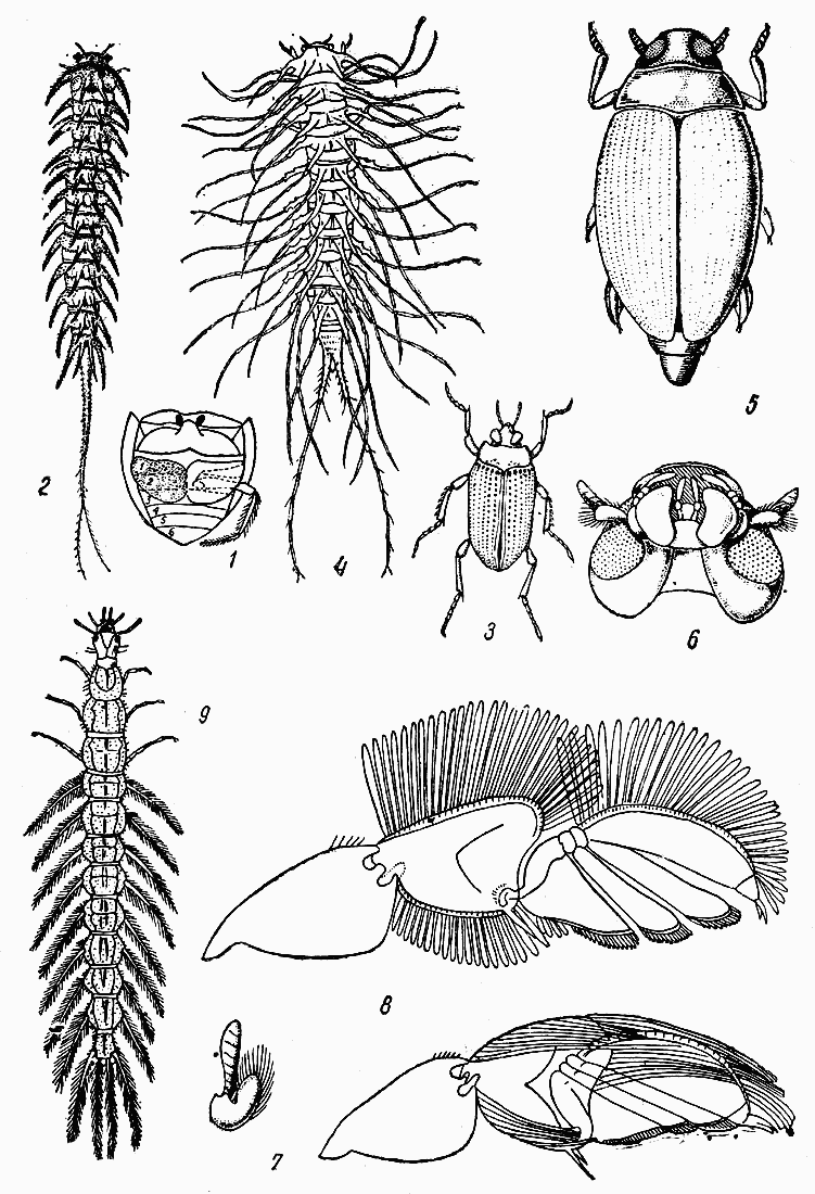 Таблица ХХХIII: Рис. 1. Плавунчик (Haliplus); часть тела с брюшной стороны (по Рейхардту и Оглоблину). - Рис. 2. Личинка плавунчика (Haliplus fulvus). - Рис. 3. Кне мидотус (Cnemidotus caesus), имаго (по Шарпу). - Рис. 4. Личинка кнемидотуса, сильно увеличена. - Рис. 5. Вертячка (Gyrinus marinus). - Рис. 6. Голова вертячки снизу. - Рис. 7. Усик вертячки. - Рис. 8. Задняя нога вертячки (Gyrinus) в двух фазах плавания. - Рис. 9. Личинка вертячки (Gyrinus marinus) (по Рейхардту и Оглоблину).