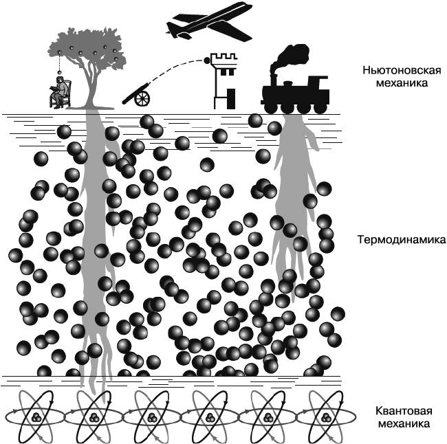 Рис. 10.1. Три уровня реальности. На верхнем уровне находится мир видимых объектов — например, падающих яблок, пушечных ядер, поездов и самолетов. Движение видимых объектов описывается законами ньютоновской механики. Ниже расположен уровень, где действуют термодинамические законы, описывающие взаимодействие частиц, движущихся в структуре вещества беспорядочно, подобно бильярдным шарам. Этот уровень отвечает также за действие принципа «порядок из неупорядоченности», который распространяется на объекты видимого мира, например паровые двигатели. Еще ниже находится уровень элементарных частиц — сфера действия стройных квантовых законов. Свойства объектов видимого мира, поддающиеся наблюдению, обусловлены особенностями либо ньютоновского, либо термодинамического уровня. Свойства живых организмов связаны с квантовой основой нашей реальности