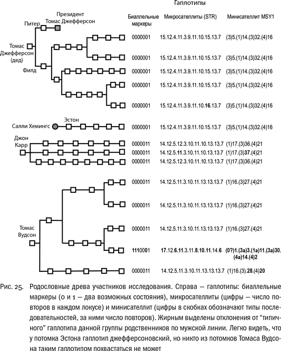 Для четверых потомков Филда Джефферсона получили идентичные картины, в пятом нашли одно отличие, вероятно, возникшее из-за мутации. Таким образом, “джефферсоновский” гаплотип у нас есть. И с ним полностью совпадает гаплотип потомка Эстона! И он достаточно редок для европейцев, так что случайное совпадение едва ли могло иметь место. А вот гаплотипы Карров выглядят совершенно иначе. Стало быть, ни один из племянников Джефферсона не мог быть отцом Эстона, а вот сам президент – мог.