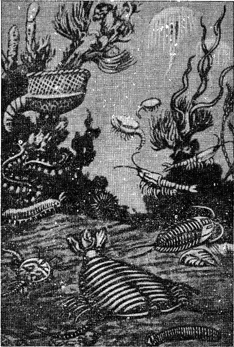Проследим дальнейший ход развития жизни. Палеозойская эра, т. е. эра древней жизни, начинается с кембрия, получившего название по месту первой находки древних остатков жизни. Суша в это время представляла собой еще пустыню. Лишь кое-где на прибрежных камнях появились пленки водорослей да подушки растений, близкие к мхам. В море обильно развились синезеленые и красные водоросли, а также представители почти всех типов животных (рис. 6). Господствующее положение занимали первые членистоногие — трилобиты. Среди них были и ползающие по дну, и плавающие, почти все имели глаза. Наряду с мелкими формами встречались виды, достигавшие полуметра. Известно более тысячи видов ископаемых трилобитов. Это была поистине процветающая группа! Из иглокожих развились морские звезды и голотурии. Появились моллюски, двустворчатые плеченогие. Продолжали развиваться черви и кишечнополостные — медузы, гидроидные полипы. Археоциаты с внутренним известковым скелетом образовали барьерные и береговые рифы.