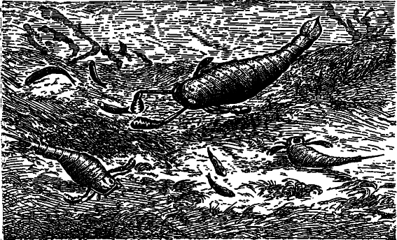 Рис. 9. Хищные трехметровые ракоскорпионы на дне силурийского моря