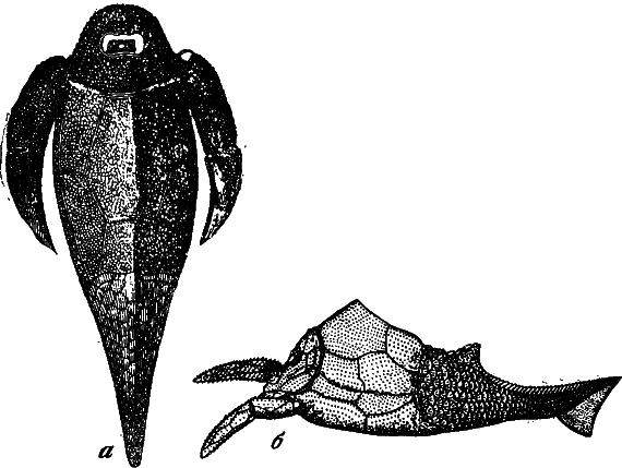 Рис. 10. Девонские «панцирные рыбы» а — вид со спины, б — вид в профиль