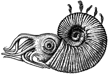 Рис. 12. Так выглядел аммонит. На раковине морские уточки (из ракообразных)