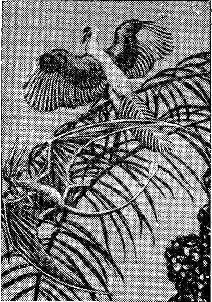Рис. 15. Летающие ящеры юрского периода: лишенный перьев птеродактиль и пернатый археоптерикс, родоначальник птиц