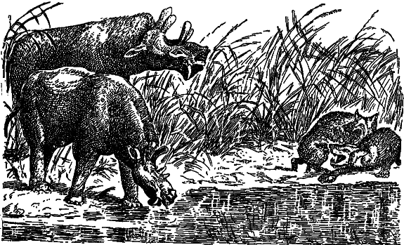 Рис. 17. Гигантские индрикотерии — крупнейшие млекопитающие, достигавшие 5 м в загривке, и два убегающих аллоцеропса (предки современных носорогов)