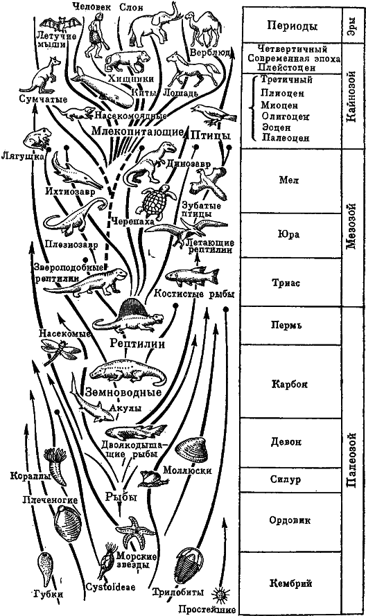 Рис. 18. Развитие животного мира от кембрия до наших дней
