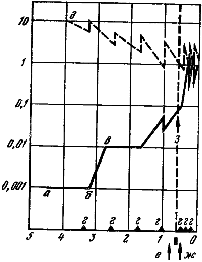 На абсциссе — возраст в млрд. лет; на ординате — содержание кислорода и углекислоты по отношению к современному (1). Вертикальный пунктир — граница докембрия и кембрия