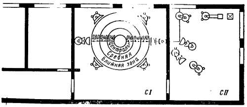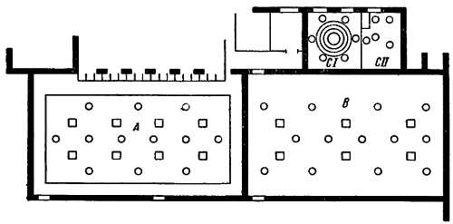 Часть основного плана экспериментального гимнастического зала с примерным оборудованием кварцевыми лампами и лампами «Соллюкс» показана на рис. 13; прямоугольник А обозначает бассейн размером 14х20 м; В — гимнастический зал размером 15х25 м; СI — «пляж», CII — установки тепловых ламп: четырехугольники изображают места для установки ртутно-кварцевых ламп, а кружки — лампы «Соллюкс».