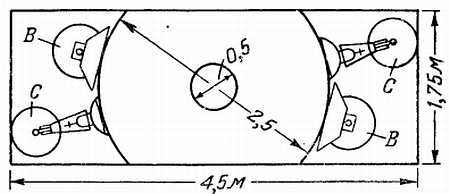 Все подобные установки, рассчитанные на облучение спортсменов ультрафиолетовыми лучами, состоят из различных комбинаций ламп: или 2–3 лампы Иезионека и 2–3 большие лампы «Соллюкс», или 2–3 лампы Баха и 1–2 лампы «Соллюкс». Располагаются они также различно, то создавая боковое освещение, составленное из ламп Иезионека, Баха и ламп «Соллюкс» на штативах, расставленных по кругу, то освещая сверху, когда в центре висит одна центральная лампа и по бокам ее висят лампы Баха, а далее расположены лампы «Соллюкс» и т. д. Ниже приводим схему наиболее упрощенного устройства кварцевого зала для облучения спортсменов (рис. 16).