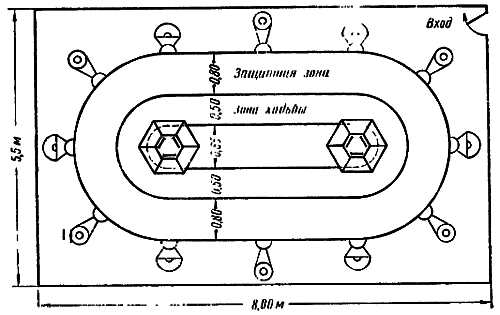 Рис. 15. План менее обширного зала для облучения ультрафиолетовыми лучами