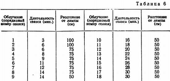 Первый сеанс облучения продолжается обычно 2–3 мин. Если через 6–8 час. после облучения появляется легкая краснота, то первый сеанс считается удачным. Если же кожа совершенно не реагирует, то следующий сеанс удлиняется до 4–6 мин.