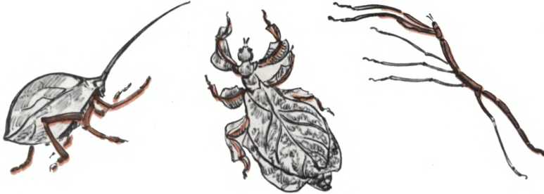 Много примеров удивительной маскировки при помощи расчленяющей окраски обнаружено у насекомых.