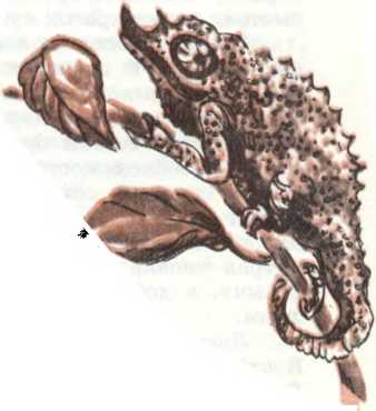 Некоторые животные могут в зависимости от обстановки изменять свою окраску. Это, пожалуй, самый совершенный камуфляж. Мгновенно меняет цвет хамелеон. Не случайно это слово стало нарицательным. Когда хамелеон охотится за насекомыми, притаившись где-нибудь на ветке дерева, он окрашен покровительственно. Цвет может быть зеленым, желтым, коричневым с крапинками и полосками; это зависит от вида хамелеона и фона, на котором он скрывается. Заметить неподвижного хамелеона очень трудно. По испанской поговорке-«замеченный хамелеон — погибший хамелеон». Но это не совсем так. Он может принимать отпугивающую окраску и становиться то небесно-голубым, то красно-бурым, то угольно-черным. Смена цветов происходит очень быстро, буквально на глазах. Описаны опыты с обезьянами, которые сначала с опаской поглядывали на хамелеона, меняющего цвет, а затем даже пятились назад.