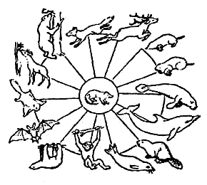 Так, схематично, выглядело заполнение всевозможных «экологических ниш» на нашей планете маленькими изначально невзрачными насекомоядными млекопитающими после гибели в конце мелового периода господствовавших на суше, а воздухе и на море, динозавров. «Чем более потомки какого-нибудь вида будут различаться между собой… тем легче им будет завладеть более многочислен-ними и более разнообразными местами в «хозяйстве», — писал Дарвин.