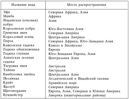 Змеи обитают на всех континентах (кроме Антарктиды, за полярный круг Северного полушария проникают только обыкновенные гадюки). На многих мелких и больших островах, удаленных от материков, змеи не водятся. Нет ядовитых рептилий также в Полинезии (ближайшие – на западе острова Фиджи, где живет одна из разновидностей аспидовых змей), в Новой Зеландии, на Мадагаскаре, на Кубе, Больших Антильских и Багамских островах.