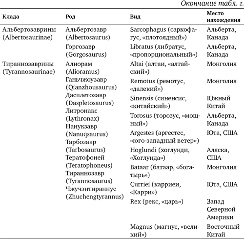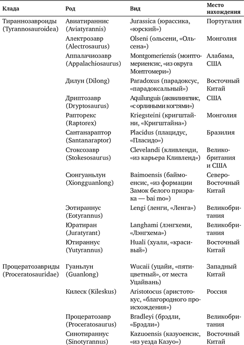 Оставим в стороне спорные названия; в настоящее время известно 29 видов тираннозавров, по поводу которых согласны почти все ученые. Это число быстро растет. В течение последнего десятилетия названия присваиваются по меньшей мере одному новому виду в год, притом что существует некоторое количество неидентифицированных окаменелостей, которые также могут оказаться останками представителей новых видов, но пока только ожидают получения формального названия от исследователей. Общее число, вероятно, еще возрастет, прежде чем наша книга увидит свет[9]. Количество открываемых видов резко увеличилось за последние годы, частично вследствие новых открытий вроде обнаружения ютираннуса и второго вида алиорама (алиорам алтайский, Alioramus altai), но также после признания того, что некоторые животные, прежде относимые к другим группам, являются на самом деле тираннозаврами, и самый очевидный пример – процератозавр. Относительно недавно это животное считалось относящимся к группе, именуемой, как можно догадаться по названию, цератозаврами, однако новые исследования, особенно работа Оливера Раухута 2010 г., дали основание предполагать, что это был один из древнейших тираннозавров. Такие изменения, основанные на данных, полученных при изучении новых скелетов или при более детальном анализе имеющегося материала, не являются в палеонтологии чем-то необычным, и в результате этих дополнительных исследований и всплеска новых открытий число тираннозавров увеличивается.