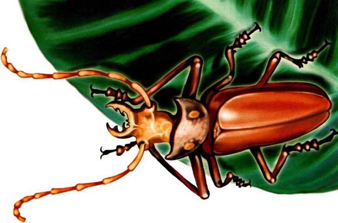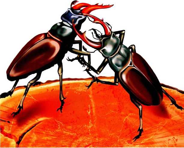 В Европе среди насекомых-гигантов знаменит жук-олень. Длина — почти 8 сантиметров! Назван так по длинным выростам, которые действительно напоминают формой оленьи рога. На самом деле это сильно развитые верхние челюсти — мандибулы. С их помощью взрослые жуки-самцы меряются силами, устраивая на ветках нечто подобное настоящим рыцарским турнирам. У самок рога-челюсти поменьше. Ведь биться друг с другом им не надо. Зато такими выростами легко прорезать кору молодых дубков, чтобы добраться до сладковатого сока деревьев.