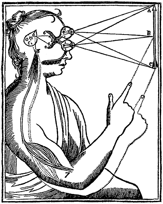 Схема механизма рефлекса по Декарту из его «Трактата о человеке». 1644.