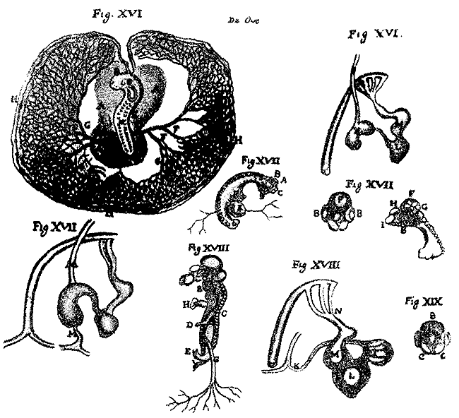 Важной вехой в истории эмбриологии была книга В. Гарвея «О зарождении животных» (1651). Он ставил в ней вопрос о новообразовании органов в процессе зародышевого развития, критиковал некоторые старые представления об эмбриогенезе (вроде утверждения, будто зародыш образуется из семени отца и материнской крови). Гарвею принадлежит афоризм; «все живое из яйца», противопоставлявший это представление допущению возможности самопроизвольного зарождения. Итальянский врач и естествоиспытатель Ф. Реди (1668) точным опытом показал, что личинки мух не зарождаются в гниющем мясе, а выводятся из отложенных на него яиц. Много данных, свидетельствующих против самопроизвольного зарождения, доставили наблюдения Сваммердама.