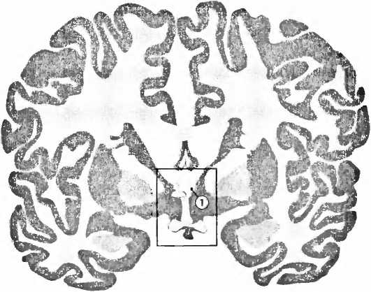 Рис. 9. В базальном отделе боковых желудочков (ventriculi laterales), выше ростральнее и медиальное миндалевидного тела, лежит (1) опорное ядро концевой полоски (bed nucleus of stria terminalis, BST), маленькая область мозга, существенная для сексуального поведения.