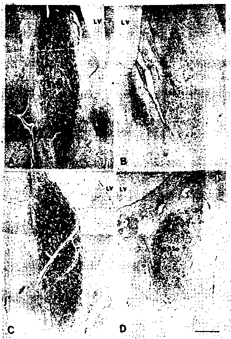 Рис. 10. Центральная часть опорного ядра концевой полоски (bed nucleus of stria terminalis, BSTc, локализацию см. на рис. 9) у мужчин (А, С) в два раза больше и содержит в два раза больше нейронов, чем у женщин (В). У М—>Ж транссексуалов мы находим BSTc женского типа (D). Единственный Ж—>М транссексуал, которого мы могли изучить (еще более редкий материал, чем мозг М—>Ж транссексуалов), действительно имел маскулинную BSTc. Это изменение полового различия у транссексуалов согласуется с их гендерной идентичностью (ощущением себя мужчиной или женщиной), а не с хромосомным полом или полом, указанным в их документах. LV — латеральный желудочек, BSTm — медиальная часть области BST (J.-N. Zhou et al., Nature, 378: 68–70,1995).