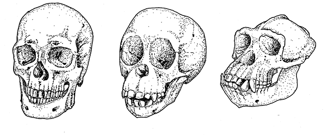 рис. 24.2. Череп взрослого мужчины (слева) по ряду признаков больше похож на череп детеныша шимпанзе (в центре), чем взрослого самца (справа).