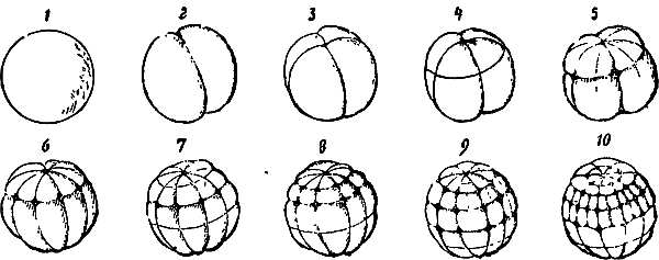 Для понимания дальнейших опытов с лягушками следует познакомиться также с тем, каким способом яйцо превращается в зародыша. Яйцо, как уже было сказано, есть одна единственная клетка, а зародыш состоит из множества клеток. Очевидно, вся суть развития заключается в том, что яйцевая клетка делится на несколько клеток. Деление это идет в следующем порядке: сначала появляется перетяжка, которая делит яйцо на две половины, при чем в таком делении и во всех последующих принимает участие и ядро, именно: сначала делится ядро, а потом протоплазма. Вторая перетяжка проходит, как и первая, по меридиану яйца и делит обе его половинки пополам, вследствие чего получаются четыре клетки. Третья перетяжка появляется на экваторе, а у лягушек в плоскости, параллельной экватору, ближе к одному полюсу. Она делит все четыре клетки пополам, вследствие чего получаются восемь клеток. Дальнейшее деление идет не со столь большой правильностью, но в результате оно дает кучку клеток. Эти клетки потом распределяются в слои, и из этих слоев формируются разные органы (см. рис.).