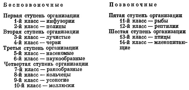Классическим примером натурфилософской классификации животных может служить схема, предложенная немецким натурфилософом Л. Океном (1810). Она имела следующий вид: