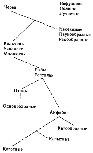 Характеристика теории типов Кювье дана в главе 12, поэтому нет необходимости возвращаться здесь к этому вопросу. Нужно, однако, отметить, что при построении своей системы Кювье не избежал определенного влияния идеи «повышения организации». Это видно из расположения им типов в порядке убывающей степени совершенства организации входящих в них животных, однако это имело часто формальное значение. В равной мере, под понятием родственных отношений, которые он отмечал между отдельными видами, он подразумевал только близость в отношении строения.