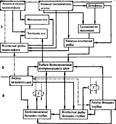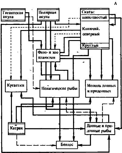 Рис. 15. Трофическне связи в морях СССР и место в них хрящевых рыб