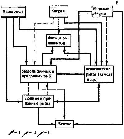 А — Баренцево; Б — Черное; В — дальневосточные моря; 1 — основные трофические связи; 2 — второстепенные связи; 3 — трофические связи, прослеживающиеся у молоди