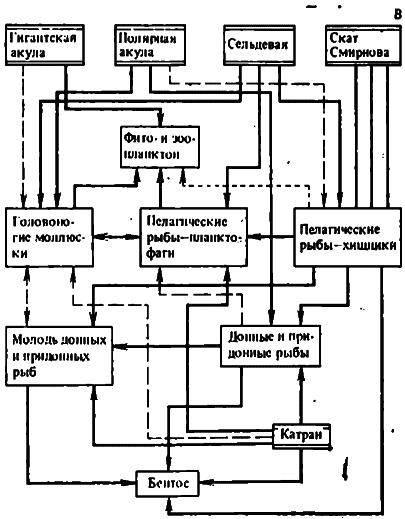 Так, в Черном море катран является практически сильнейшим хищником, который конкурирует лишь с дельфинами, осетровыми и акулообразными — скатами, хвостоколом и морской лисицей (см. рис. 15, Б). Врагов у акулообразных в бассейне нет. Аналогичное место занимают акулообразные (исключая межвидовую борьбу внутри группы) в других морях Европы и у берегов Северной Америки. На Дальнем Востоке роль хищных акул велика. Между 40 и 60° в. д. сельдевая акула — сильнейший хищник, имеющий конкурентов только среди морских млекопитающих, южнее ее место занимают многочисленные акулы открытого океана (например, голубая), а севернее — тихоокеанская полярная акула (рис. 15, В). Определенные высокие «уровни» пищевой пирамиды здесь занимают два других массовых вида акулообразных — катран (S. acanthias subsp.) и скат Смирнова (Batyraja smirnovi smirnovi). Зимой они «контролируют» южные районы региона, а летом поднимаются на север до 55° с. ш.