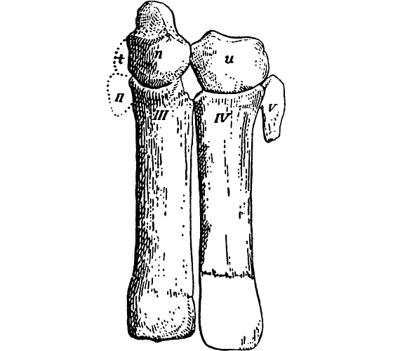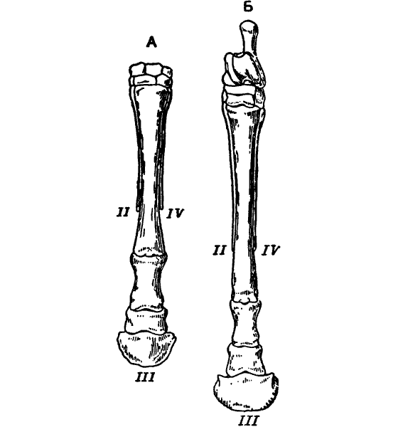 III — третий палец, II и IV — остатки второго и четвертого пальцев (грифельные косточки).