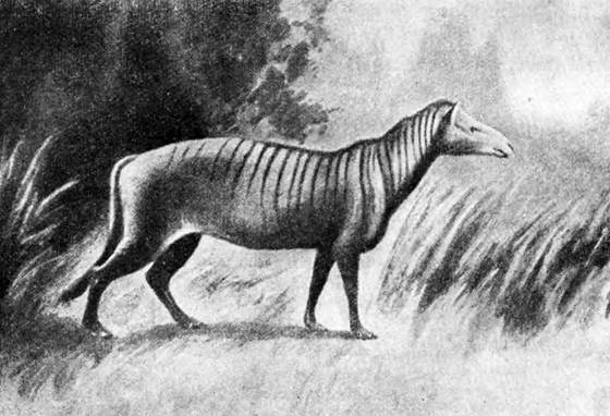 Предполагаемый внешний вид гиракотерия, одного из предков лошади. Величиной он был не больше крупной собаки, на передней ноге имел четыре, на задней три пальца.