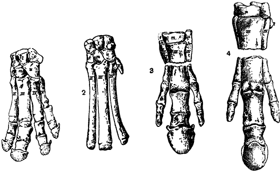 Постепенное недоразвитие боковых пальцев у непарнокопытных (передняя нога):